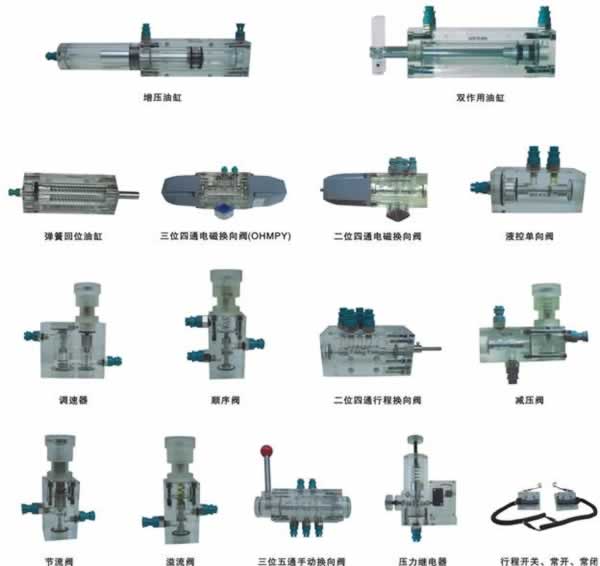 2、透明液壓實(shí)驗(yàn)臺(tái)主要由實(shí)驗(yàn)桌、實(shí)驗(yàn)支架、液壓元件和電器控制器件、可編程控制器(PLC)等組件組成。